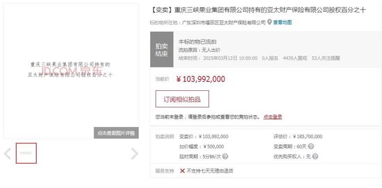3月12日,《国际金融报》记者在京东资产交易平台注意到,重庆三峡果业集团有限公司(下称“三峡果业”)所持亚太财产保险有限公司(下称“亚太财险”)10%股权司法变卖于当天上午截止,最终因无人报名而流拍。