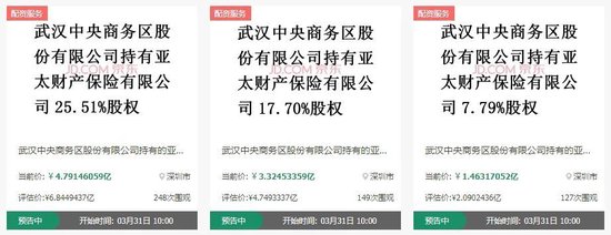 随后,亚太财险控股股东武汉中央商务区股份有限公司(下称“武汉中央商务区”)持有的该公司51%股权将被拆分为三笔,于3月31日公开拍卖,合计起拍价为9.58亿元。